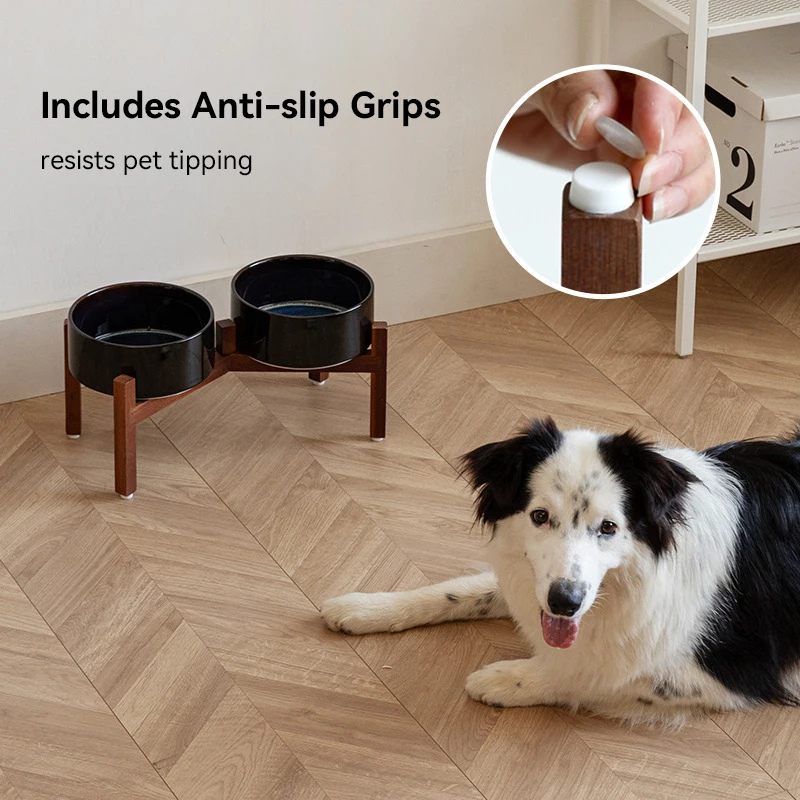 This elevated ceramic pet bowl set is designed to make feeding time more comfortable for your pet. The double-bowl design allows you to serve both food and water at the same time. Each bowl is made from durable ceramic that is safe, sturdy, and easy to clean. The raised wooden stand helps promote better digestion by keeping your pet in a natural feeding position. Its stable base prevents the bowls from sliding during meals. The large capacity bowls are perfect for medium and large dogs, as well as multiple pets. The elegant wooden stand adds a stylish touch to your home décor. The non-slip design keeps the feeding station steady on most floor surfaces. The bowls are removable for quick refilling and simple washing. This modern feeding solution combines comfort, durability, and style for everyday pet care.